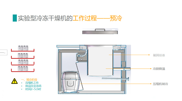 -凍干機工作過程:在這一階段,壓縮機啟動并通過冷卻系統降低凍干室內的溫度,目的是將樣品迅速降至冰點以下,確保樣品完全凍結。該過程通常持續2至5小時,確保樣品中的水分以固態形式存在,形成冰晶,為后續的升華過程奠定基礎。此階段的成功實施對后續凍干效果至關重要。