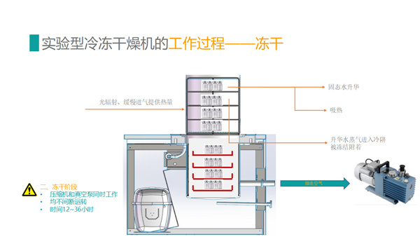 -凍干機工作過程:當樣品完全凍結后,進入凍干階段。在此階段,凍干機開始在低溫和低壓條件下進行升華干燥。通過控制系統,樣品中的水分由固態冰直接轉變為氣態水蒸氣,而不經過液態水階段。這一過程依賴于冷凝裝置,升華出的水蒸氣被及時冷凝并收集。凍干階段的持續時間一般為12至36小時,具體時長根據樣品類型、冷凝能力以及操作參數的不同而有所變化。該階段的核心在于逐步去除樣品中的水分,同時最大限度保留其物理和化學特性。