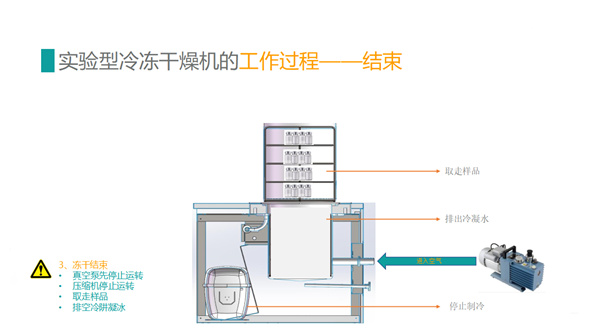 -凍干機工作過程:在凍干過程接近尾聲時,冷凝系統完成對水蒸氣的收集,且樣品的水分基本完全去除。此時,壓縮機停止運行,凍干機進入結束階段。設備排出剩余的冷凝水,樣品可以從凍干機中取出,完成整個凍干過程。取出的樣品已處于穩定的無水狀態,并能長期保持其結構和活性。